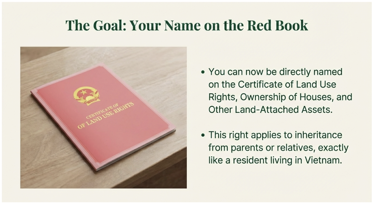 - You can be directly named on the Certificate of Land Use Rights, Ownership of Houses and Other Land-Attached Assets (commonly known as the Red Book/Pink Book) without having to ask a relative in Vietnam to hold the title on your behalf (a practice that inherently carries significant risks of disputes).