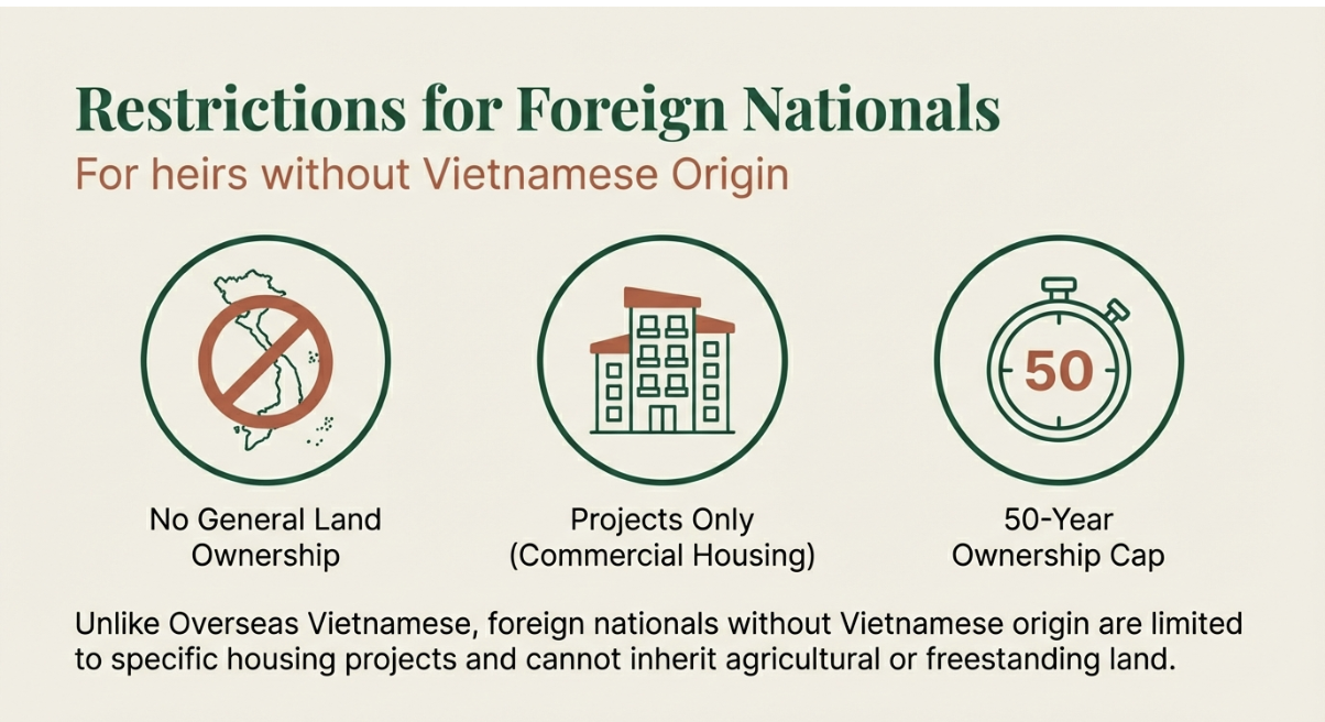 Note for Foreign Nationals (Without Vietnamese Origin): Unlike Overseas Vietnamese, the laws regarding foreigners inheriting housing and land are much stricter. Foreign nationals are not entitled to general “land ownership” (land use rights). They are only permitted to inherit housing (apartments or individual houses) located within commercial housing construction investment projects, and the ownership duration is typically limited (usually a maximum of 50 years).