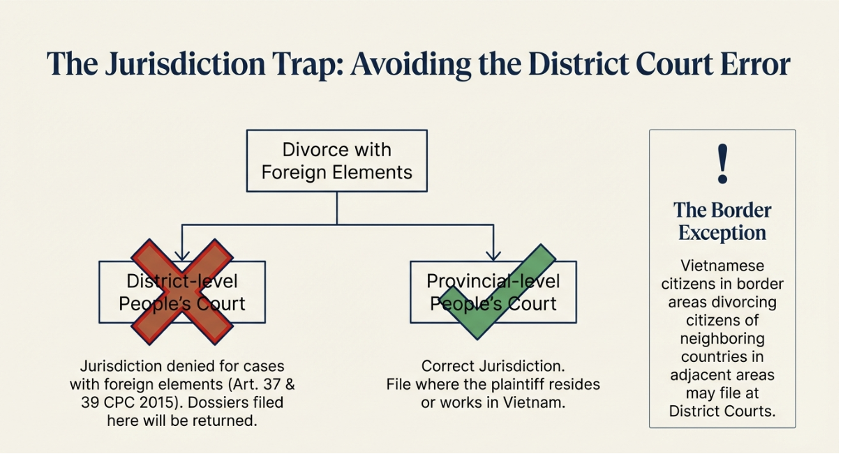 • Exception: If the divorce involves a Vietnamese citizen residing in a border area and a citizen of a neighboring country residing in the adjacent border area with Vietnam, the District-level Court where the Vietnamese citizen resides has jurisdiction.