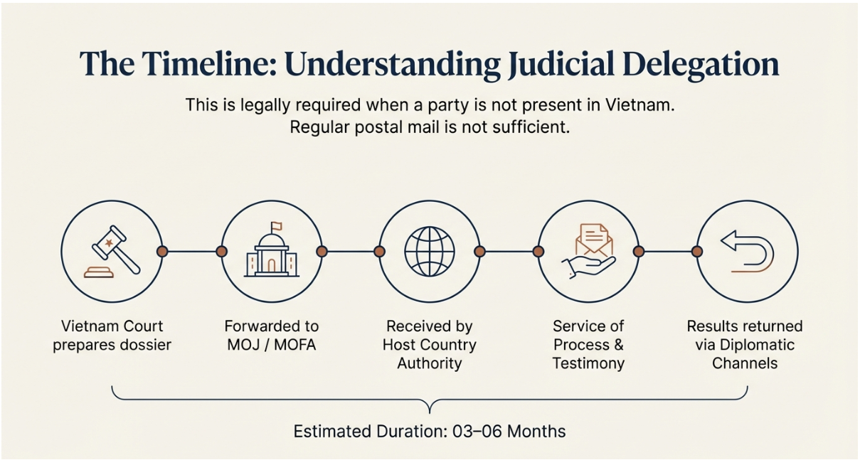 When one party is not present in Vietnam, the Court cannot send summons via regular postal mail. Instead, it must strictly carry out the Judicial Delegation (Mutual Legal Assistance) procedure. This is usually the most time-consuming phase in a divorce when the husband/wife is abroad.