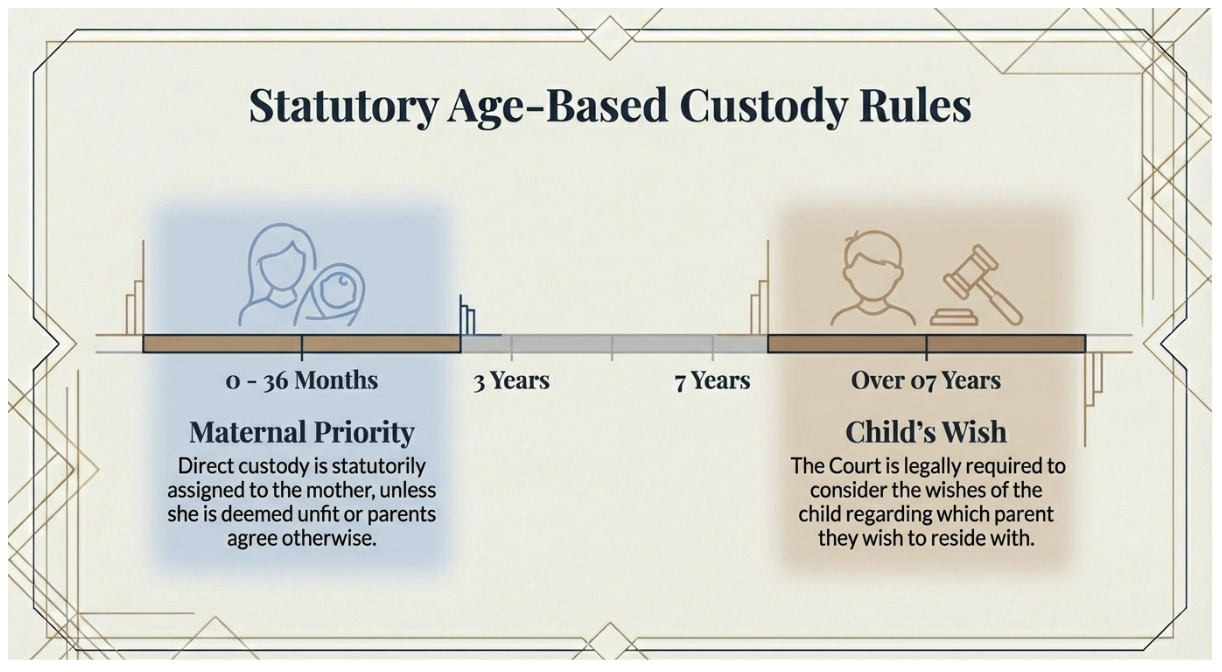 • Children under 36 months: Direct custody is statutorily assigned to the mother, unless she is deemed unfit or the parents agree otherwise.