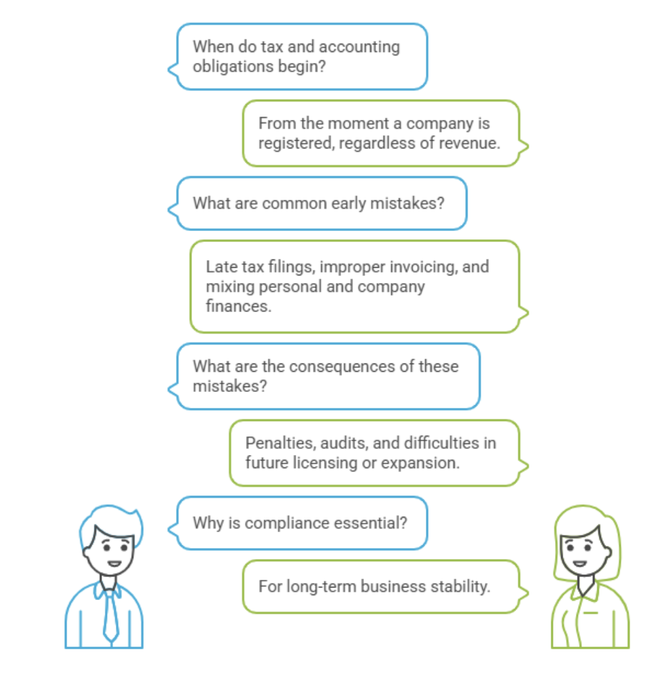 Tax and accounting obligations apply from the moment a company is registered, regardless of whether it has generated revenue. Many foreign startups make early mistakes such as late tax filings, improper invoicing, or mixing personal and company finances. These errors may seem minor at first but can result in penalties, audits, and difficulties in future licensing or expansion. Proper tax and accounting compliance is therefore essential to long-term business stability.