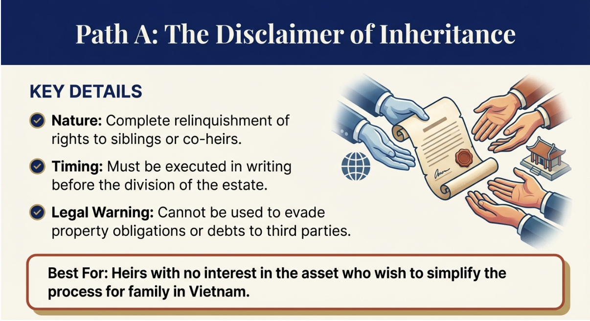 - Nature: The heir abroad voluntarily relinquishes their entire share of the estate to their siblings or other co-heirs in Vietnam.