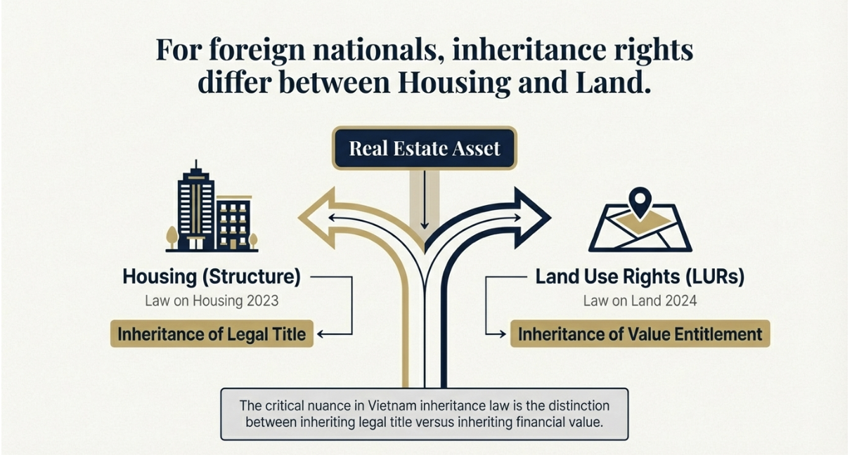 For foreign nationals, the most critical nuance in Vietnam inheritance law lies in the distinction between inheriting legal title (ownership) versus inheriting the financial value of the property.