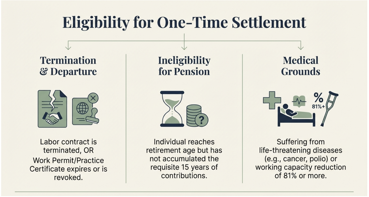Foreign workers are legally permitted to request a one-time payout in the following instances: