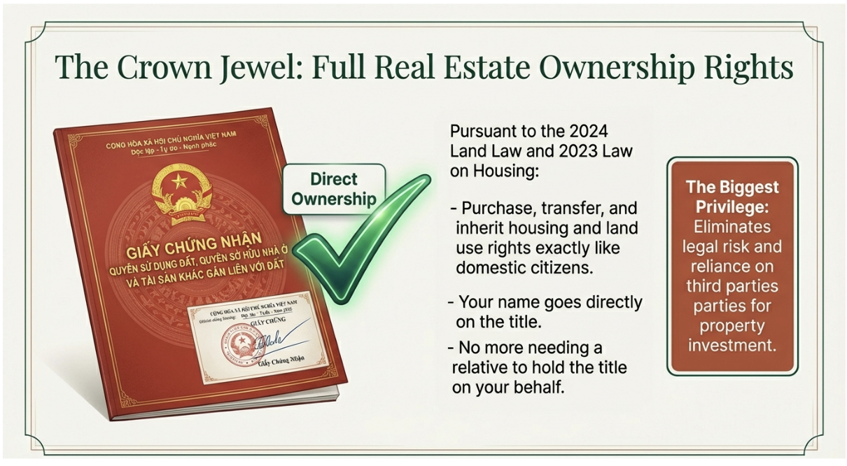 • Real Estate Ownership Rights (The Biggest Privilege): Pursuant to the 2024 Land Law and the 2023 Law on Housing, people of Vietnamese origin residing abroad have the right to purchase, receive the transfer of, and inherit housing and land use rights exactly like domestic Vietnamese citizens. You are fully entitled to have your name directly registered on the Red Book/Pink Book without needing a relative to hold the title on your behalf.