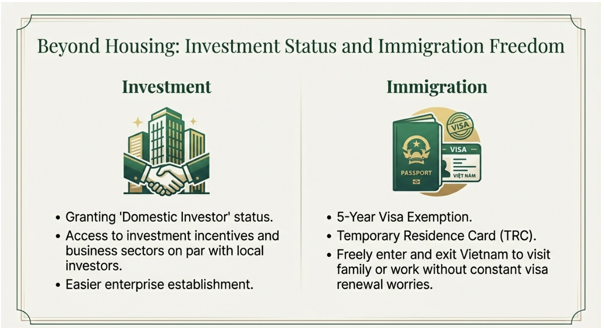 • Investment and Business Rights: Overseas Vietnamese are granted domestic investor status, allowing them to enjoy investment incentives, freely establish enterprises, and access business sectors on par with local investors.