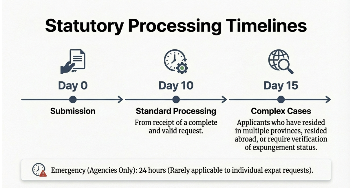 - Complex Cases: For applicants who have resided in multiple provinces or abroad, or requiring verification of expungement status, the timeline is extended to 15 days.