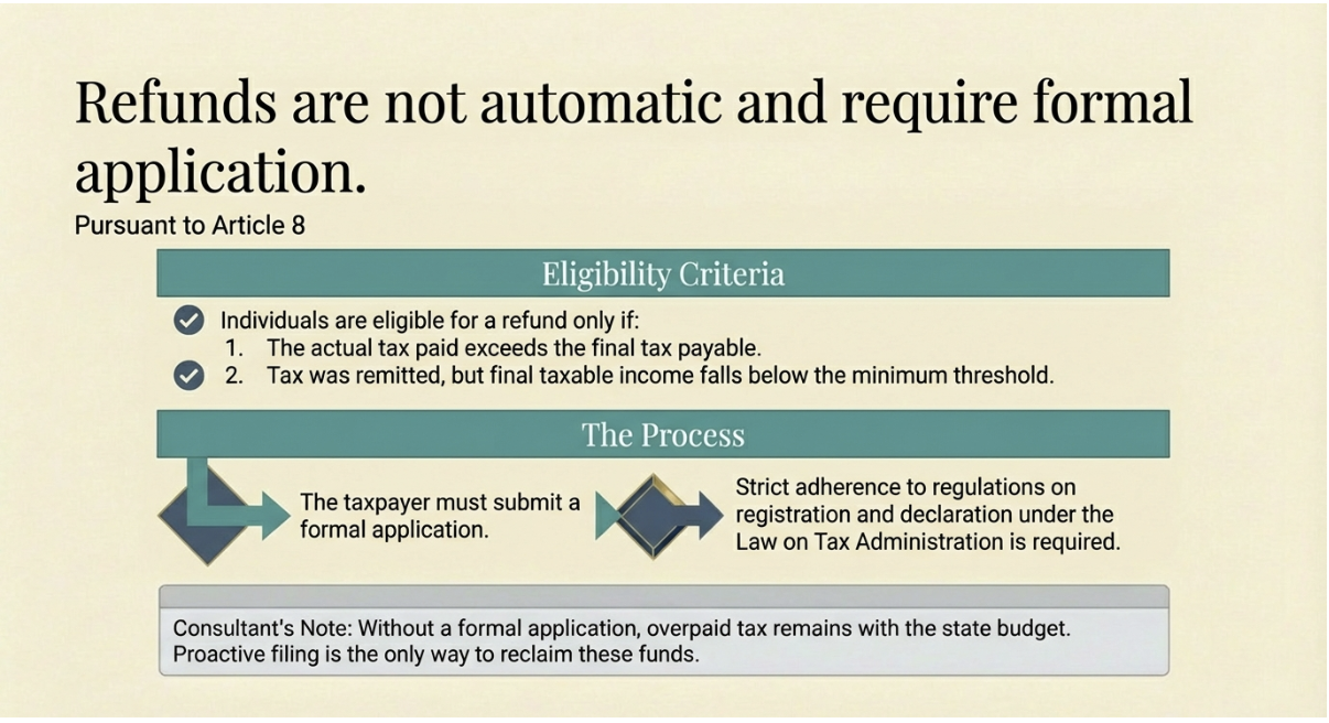 Overpayment of taxes does not trigger an automatic refund; the taxpayer must submit a formal application. Under Article 8, an individual is eligible for a refund in the following instances: